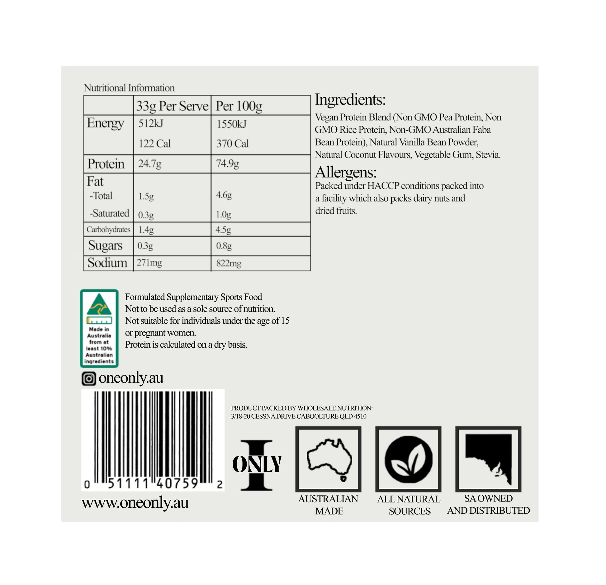 VANILLA - Vegan Protein Blend (Non-GMO Pea Protein, Non-GMO Rice Protein, Non-GMO Australian Faba Bean Protein), Natural Vanilla Bean Powder, Natural Coconut Flavours, Vegetable Gum, Stevia.